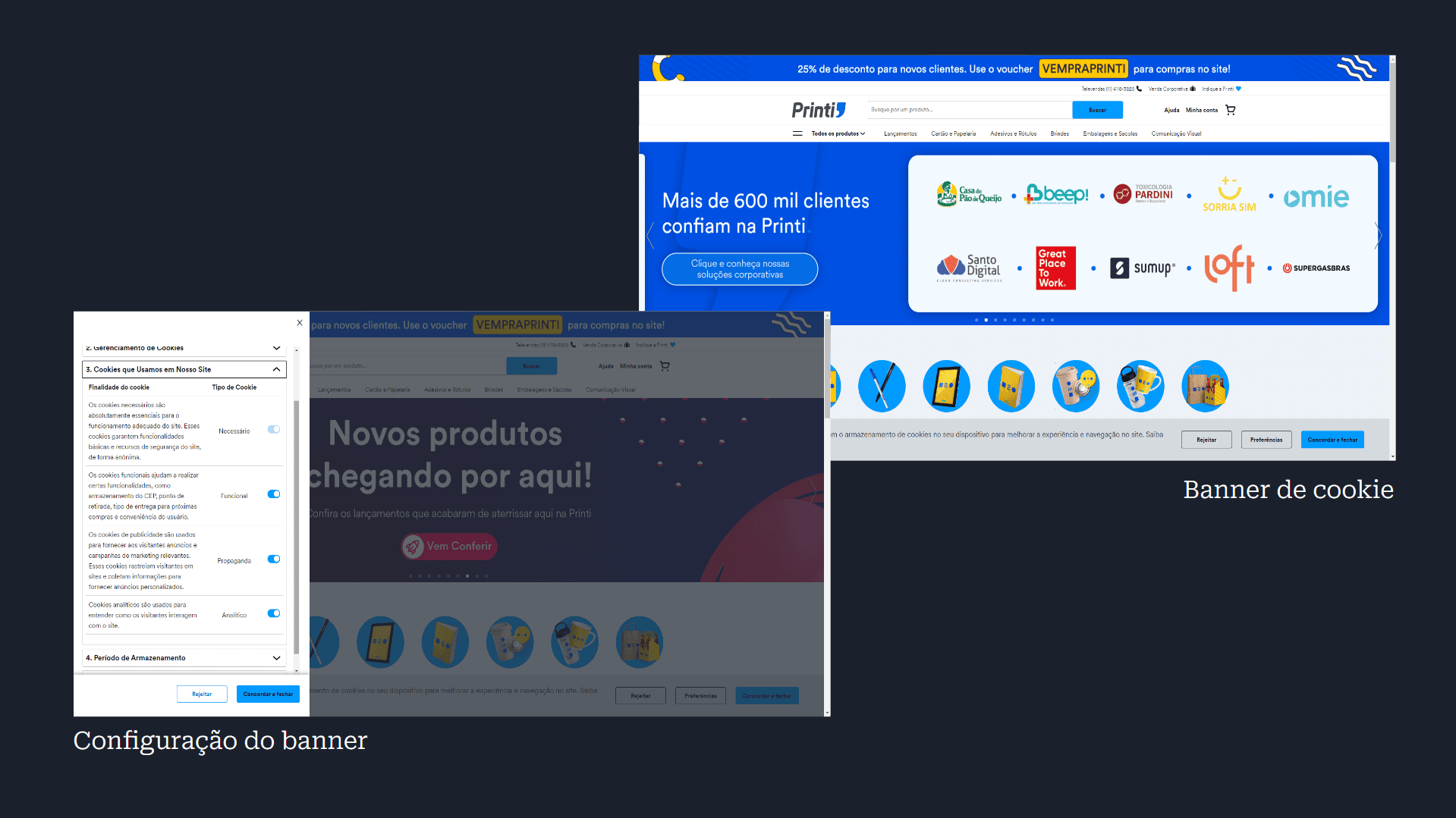Conformidade com as regras: O site da Printi agora está em conformidade com as novas regras do grupo Cimpress em relação à política de cookies. Isso coloca a Printi em uma posição mais segura em termos de conformidade regulatória e possíveis penalidades;