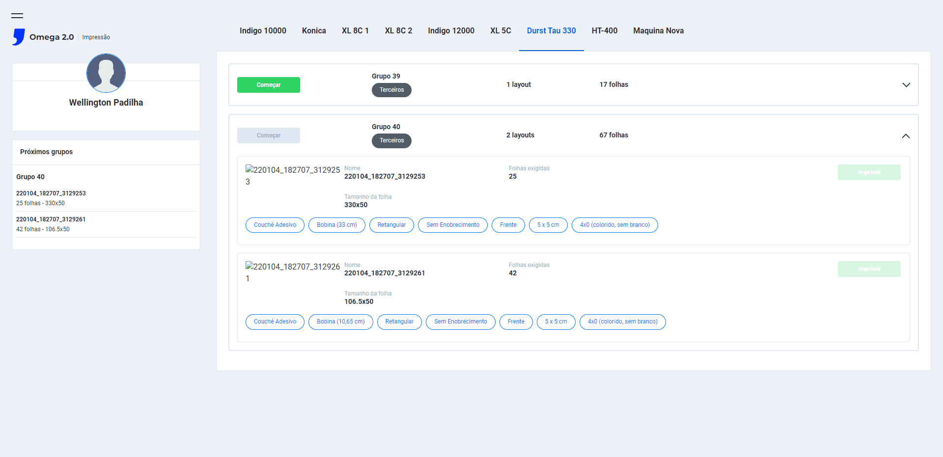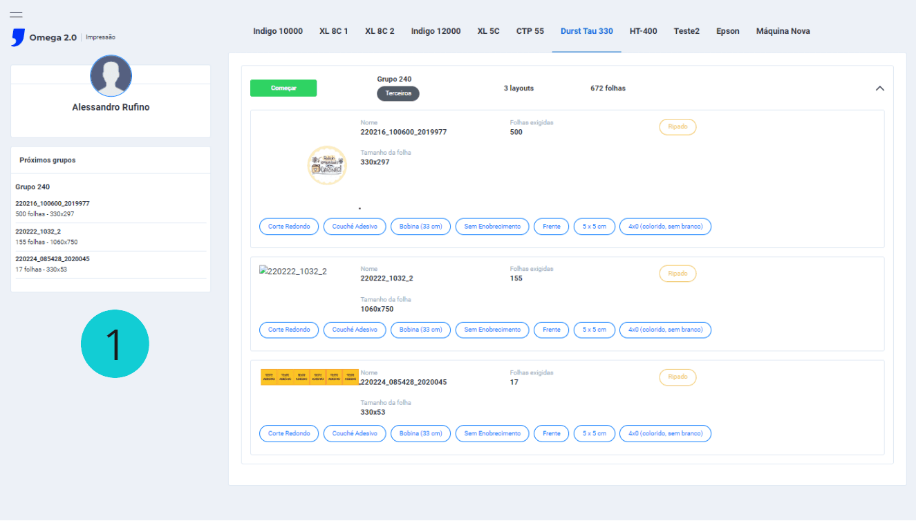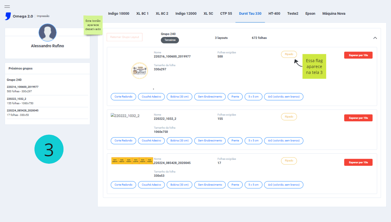 Na tela Impressão > Durst Tau 330 > O botão verde Iniciar do grupo está funcionando, quando clicado os itens do grupo começam uma contagem regressiva (botão vermelho) e se inicia o processo de Ripar e Iniciar a impressão dos itens, os status de cada item do grupo é alterado de waiting_planning para printing;