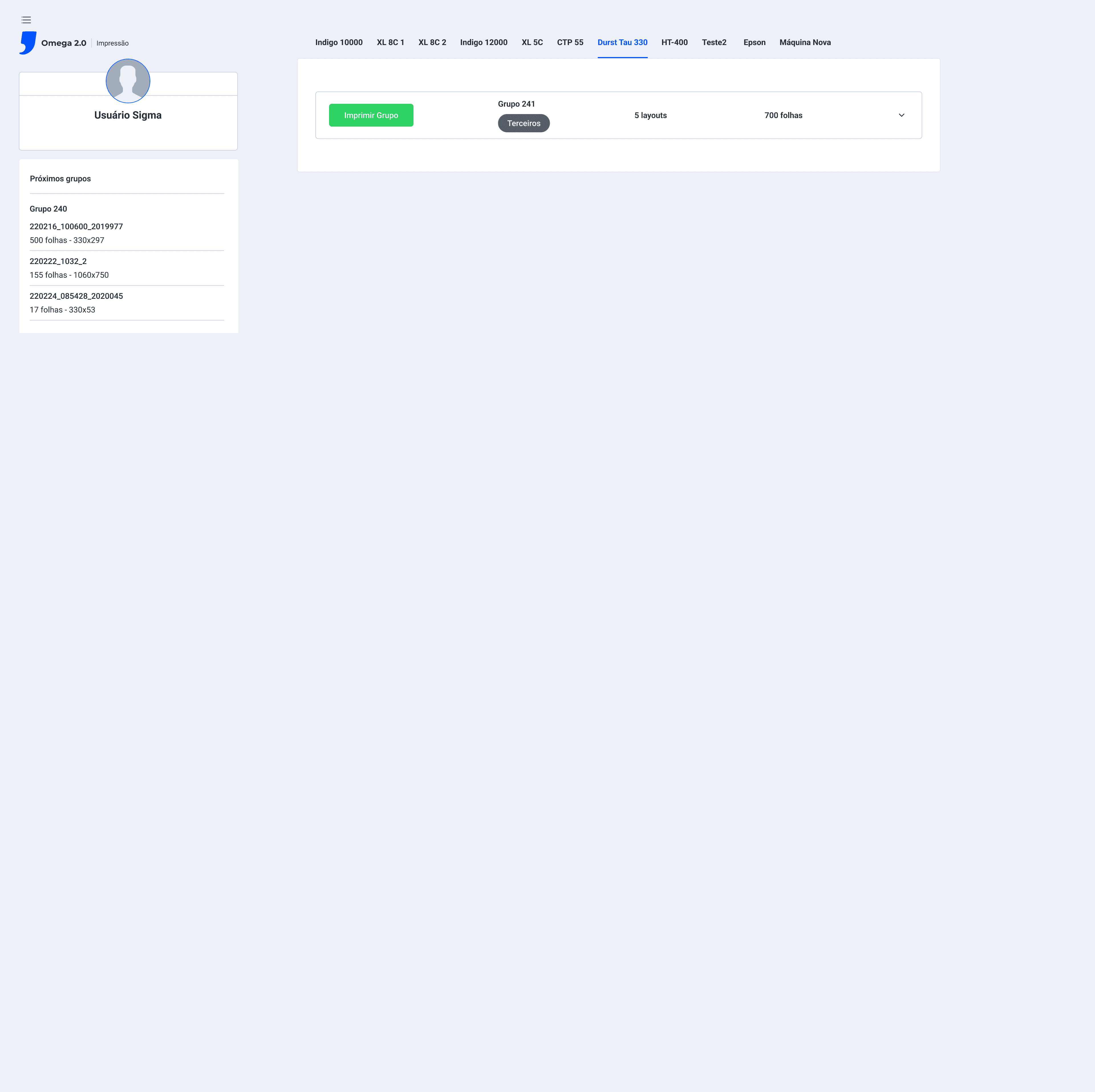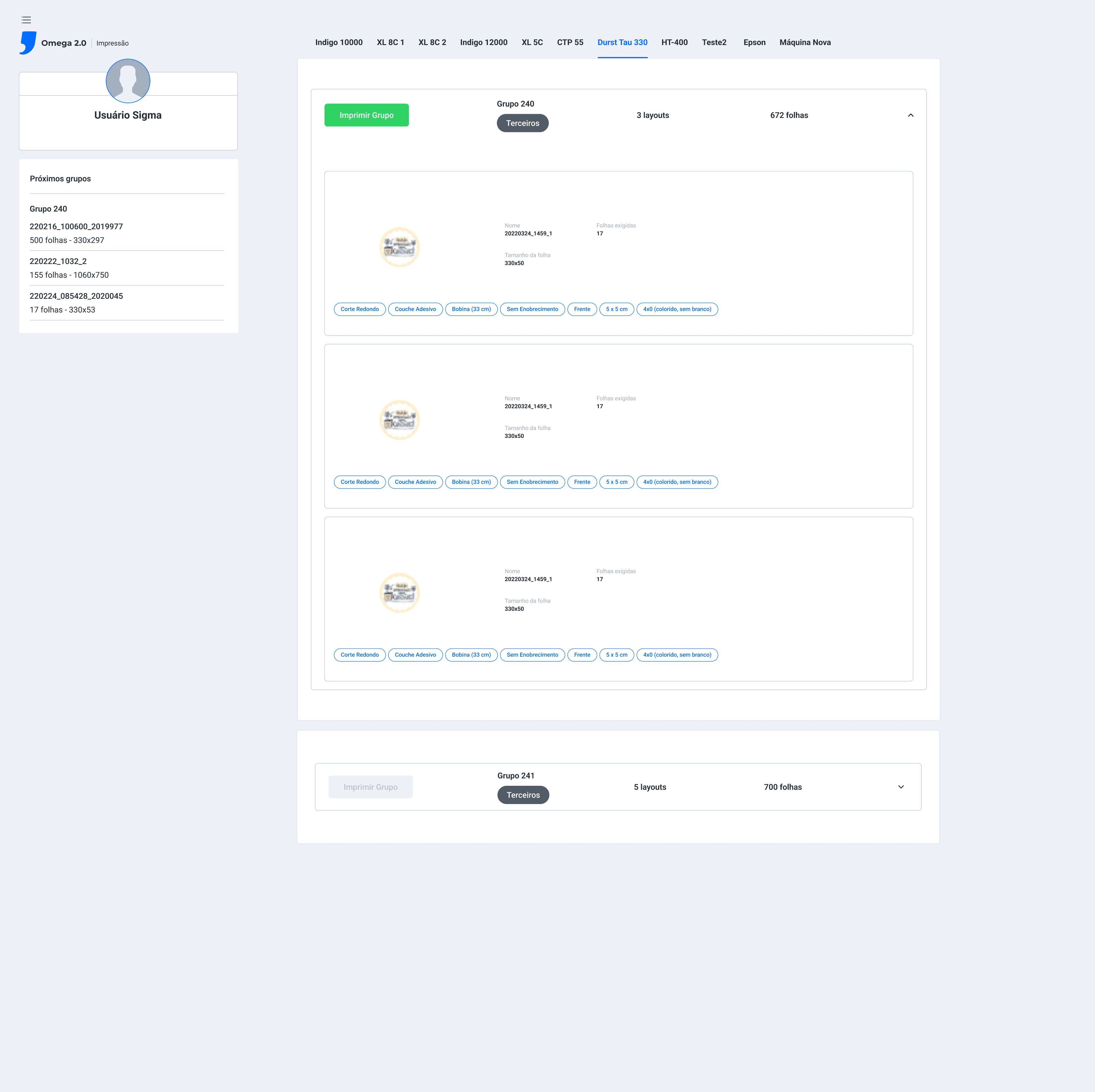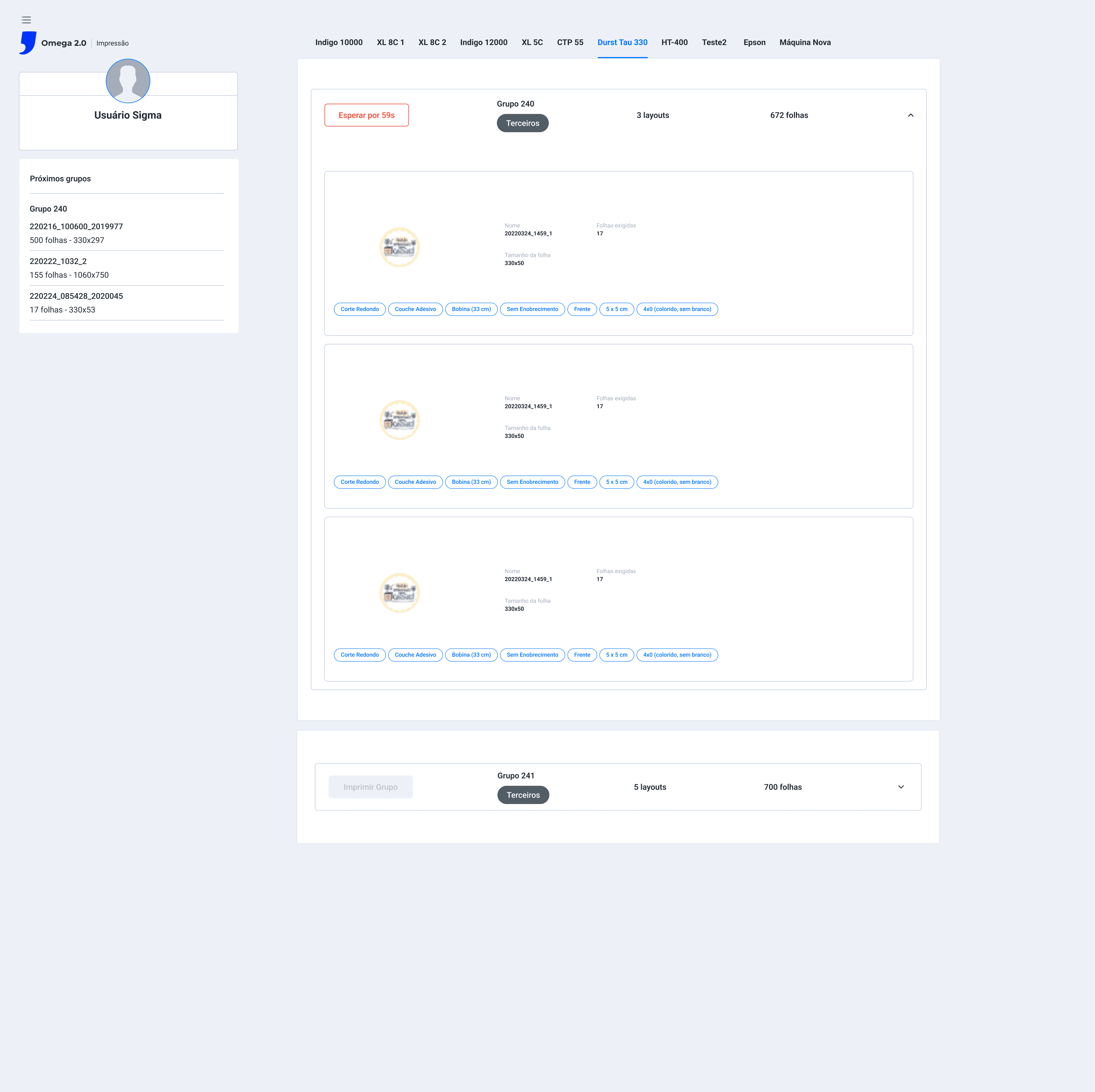 Na tela Impressão > Durst Tau 330 > O botão verde Iniciar do grupo está funcionando, quando clicado os itens do grupo começam uma contagem regressiva (botão vermelho) e se inicia o processo de Ripar e Iniciar a impressão dos itens, os status de cada item do grupo é alterado de waiting_planning para printing;