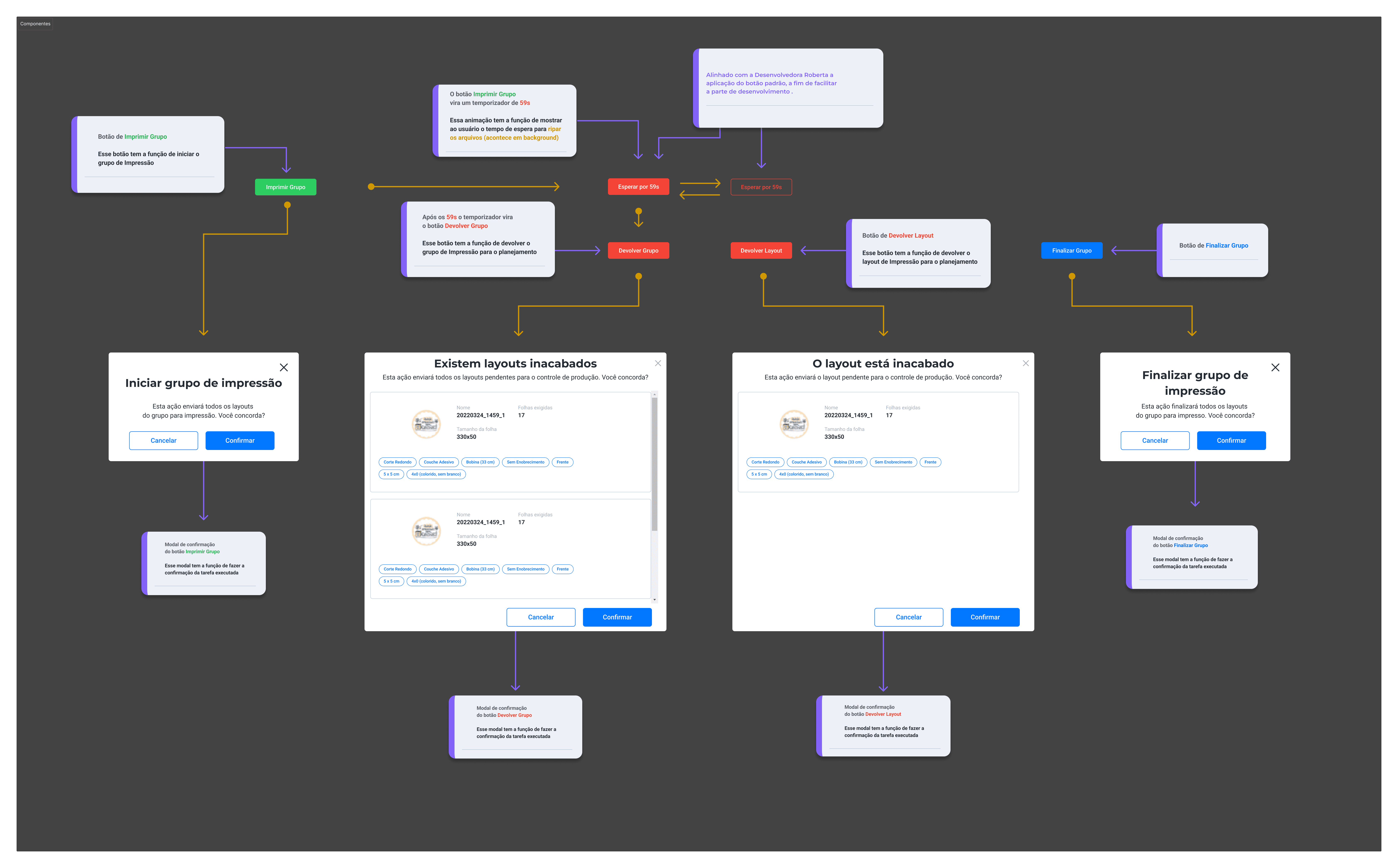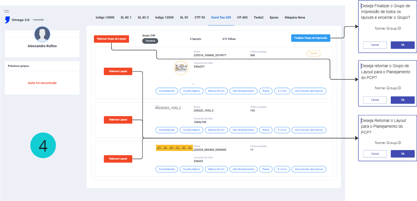 O botão vermelho Finalizar para o grupo tem a ação de retornar os itens para a tela de planejamento do PCP (altera o status de printing para waiting_planning) este botão poderia ser descrito com outro nome;